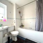 Suite comprising a bath with shower over, WC, wash hand basin, radiator, part tiled walls, window to the rear.