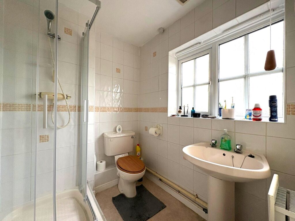 Suite comprising a shower enclosure with thermostatic shower, WC and wash hand basin. Radiator, part tiled walls, window to the rear.