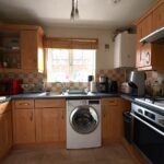 Fitted range of base units incorporating cupboards and drawers beneath a work surface. Further range of matching wall units. Inset sink, inset 4 ring gas hob with electric oven below and hood above. Space for washing machine and fridge/freezer. Wall mounted boiler, Window.