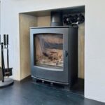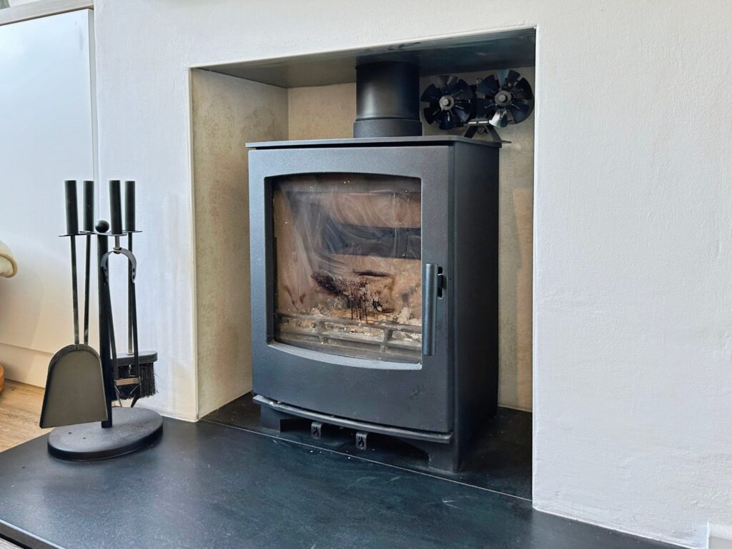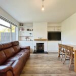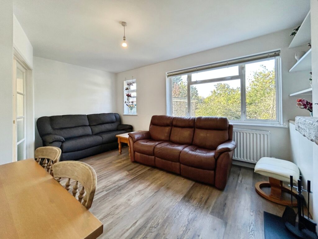 Spacious reception room with large rear window, fitted log burner, and access to understairs storage. Outlook to the garden.