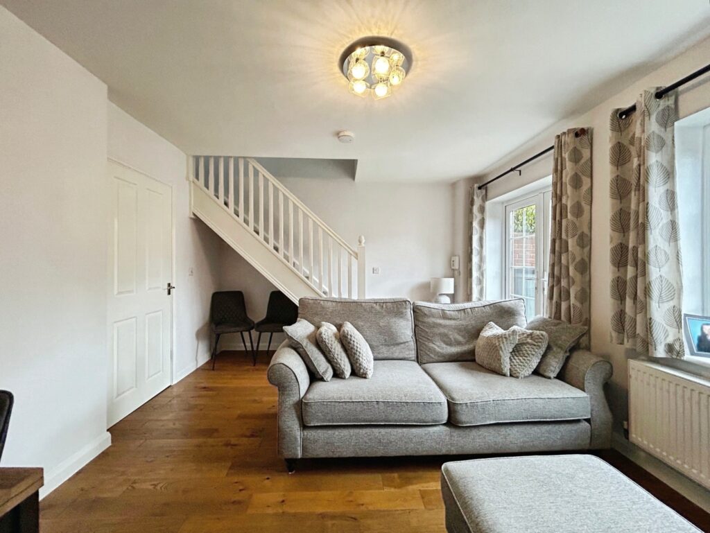 The property is entered via an entrance hallway, which leads to a modern, separate kitchen fitted with a range of base and eye-level units, an oven, gas hob, and space for a washing machine and dishwasher. The hallway also provides access to a downstairs WC and a useful storage cupboard. From the hallway, a door opens into the lounge/dining room, a good-sized reception space with stairs to the first floor, a window overlooking the rear garden, and double doors opening onto the garden, allowing plenty of natural light.