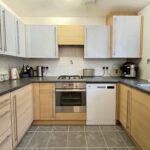 Modern kitchen fitted with a range of base and eye-level units, oven, gas hob, and space for a washing machine and dishwasher.