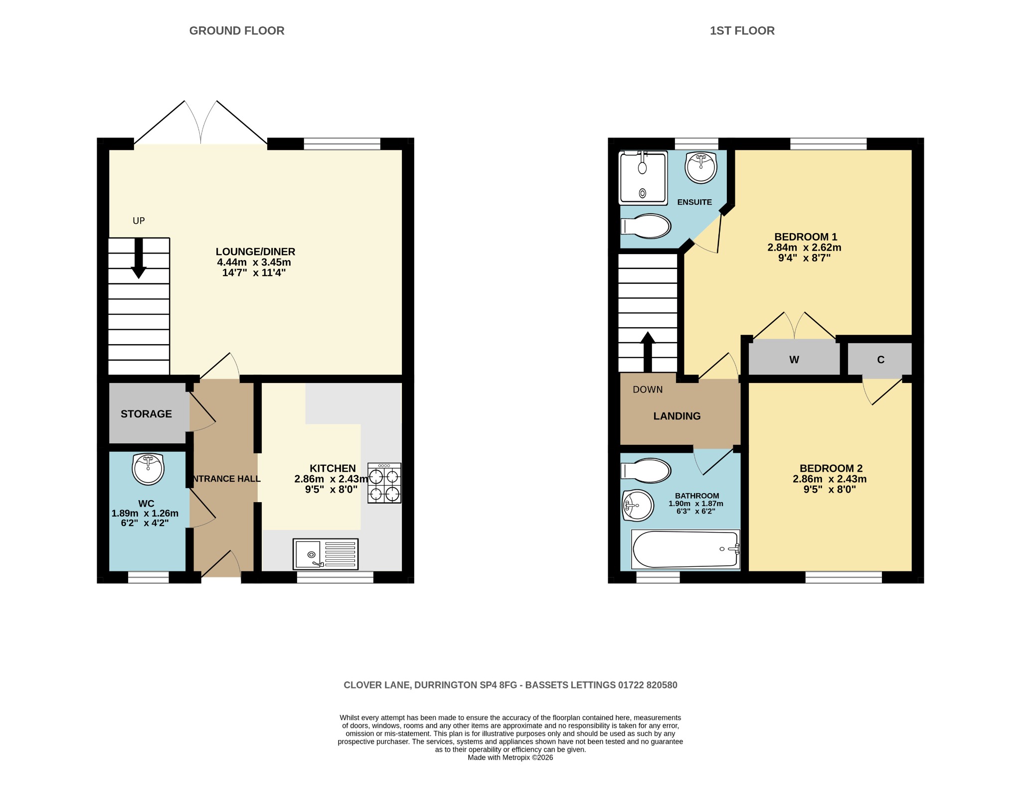 Upstairs, Bedroom 1 features an en-suite shower room, complete with a shower, hand basin, and WC. The second bedroom is a generous size, ideal as a guest room or home office. The family bathroom is also on this floor and is fitted with a modern suite, including a bath with a hand-held shower attachment, wash hand basin, and WC.