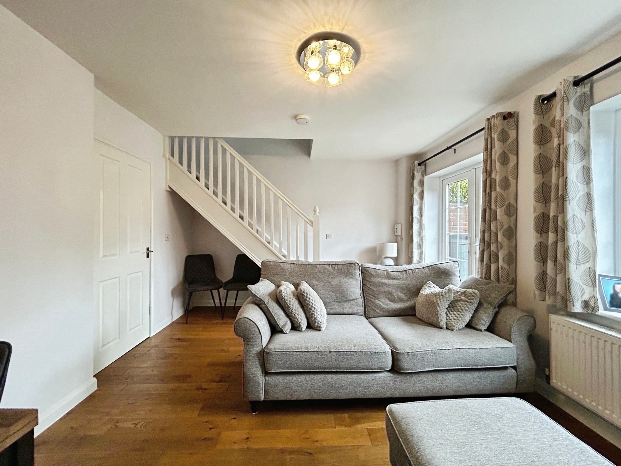 The property is entered via an entrance hallway, which leads to a modern, separate kitchen fitted with a range of base and eye-level units, an oven, gas hob, and space for a washing machine and dishwasher. The hallway also provides access to a downstairs WC and a useful storage cupboard. From the hallway, a door opens into the lounge/dining room, a good-sized reception space with stairs to the first floor, a window overlooking the rear garden, and double doors opening onto the garden, allowing plenty of natural light.