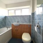 Modern fitted white suite comprising a bath, WC and a wash hand basin with a cupboard under. Heated towel rail, window to the front.