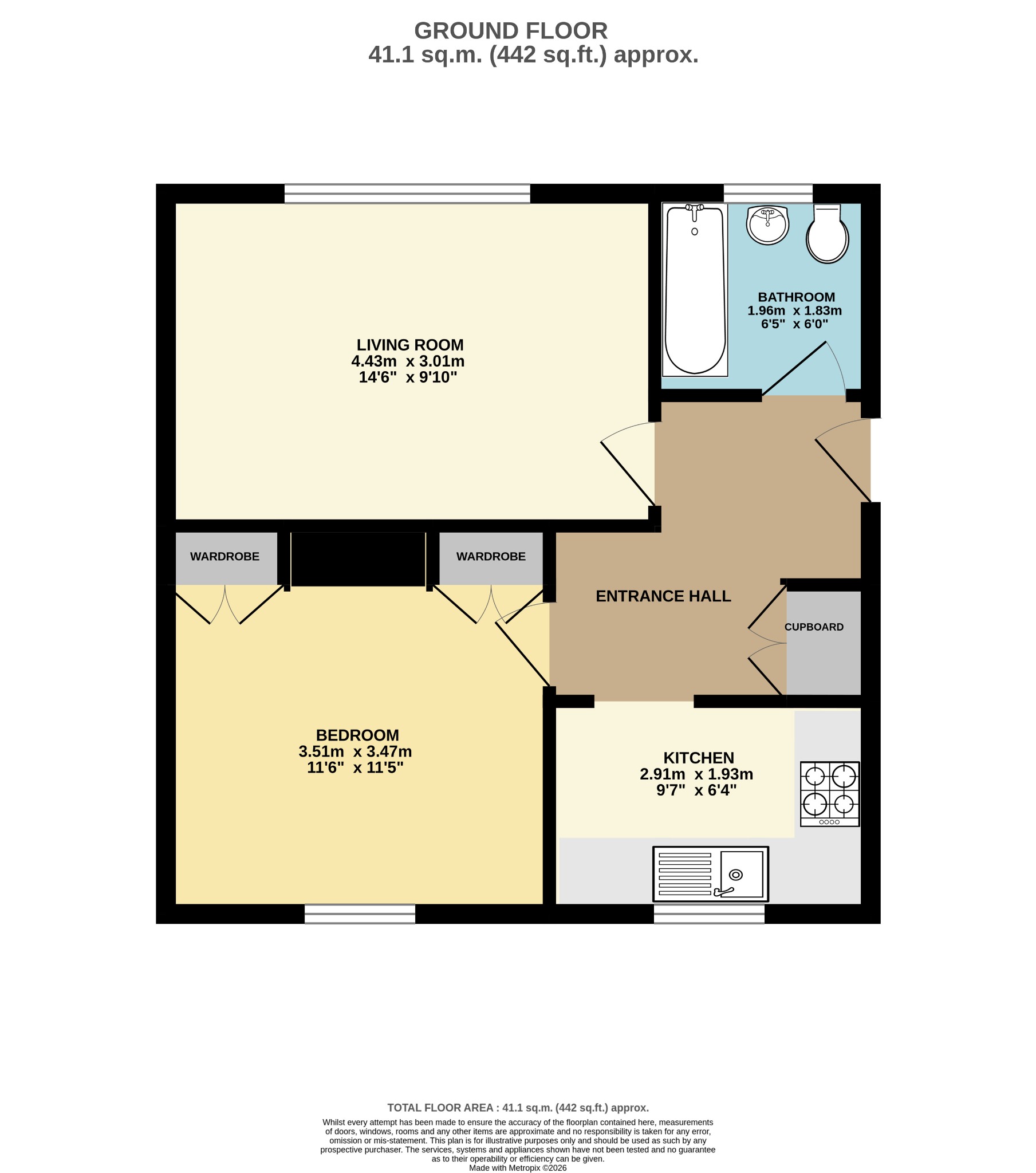 From the footpath a communal security front door opens to the communal hall and the front door to the property. The welcoming entrance hall has a built in cupboard and doors open to all rooms. The pleasant living room is a lovely space for the owners to relax, having a window that faces to the front. The modern kitchen has a range of cabinets and a built in oven, hob and hood. The boiler was replaced on the 3rd March 2026. A window faces to the rear. The double bedroom benefits from two built in wardrobes and a window overlooks the rear. The bathroom comprises a modern white suite and a window faces to the front. Outside there is a storage shed and an area of garden which we understand the property has use of within the ground rent. Parking is found on the street or to the left hand side of the building where there is a ‘first come, first served’ parking area.