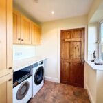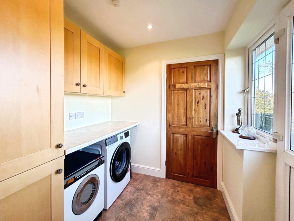 Window and door to the rear garden, and access to the cloakroom. Offers additional worktops with space for a washing machine and tumble dryer, plus wall-mounted cabinetry.