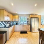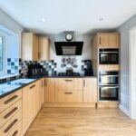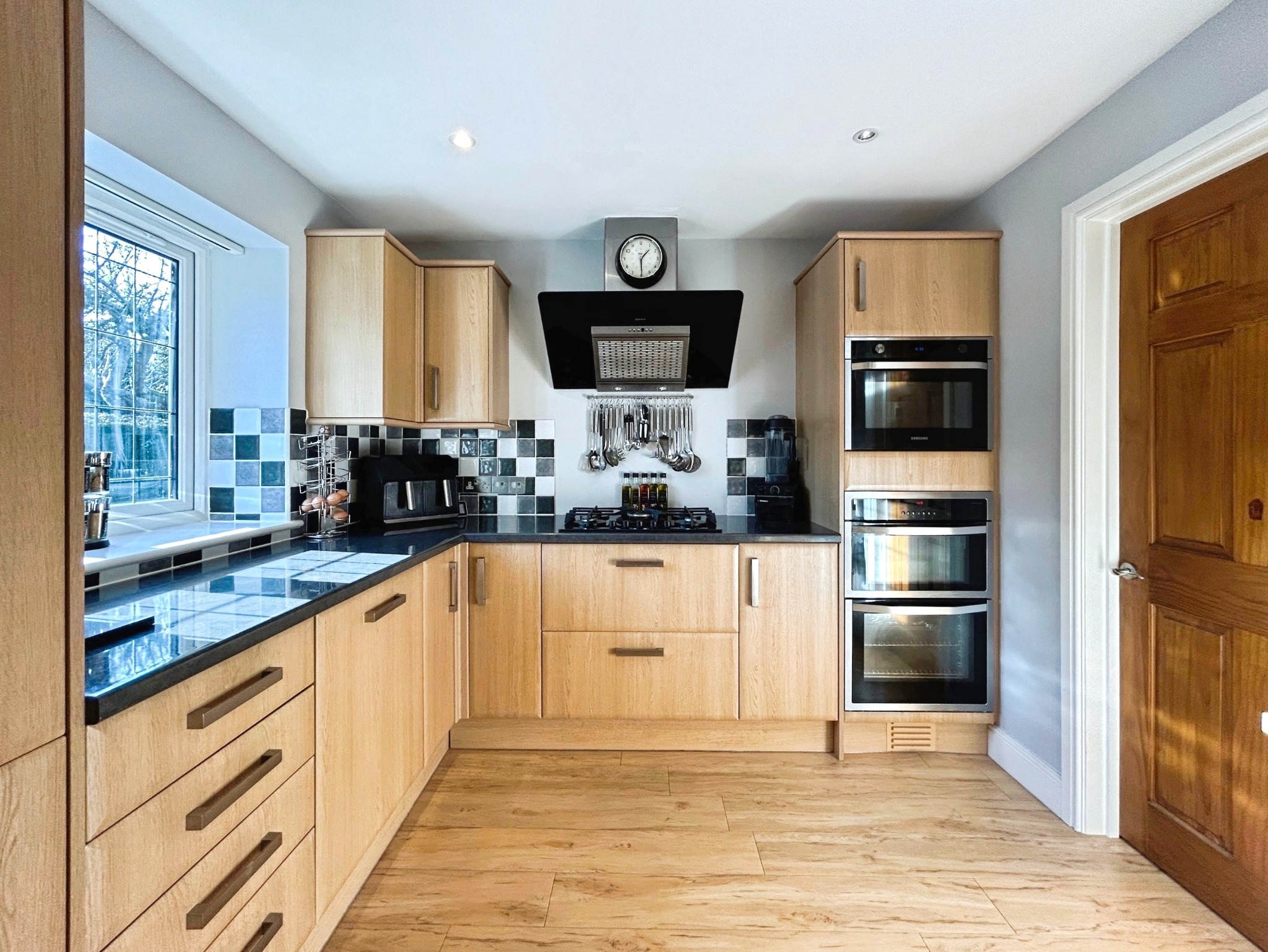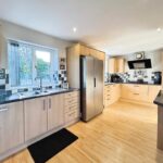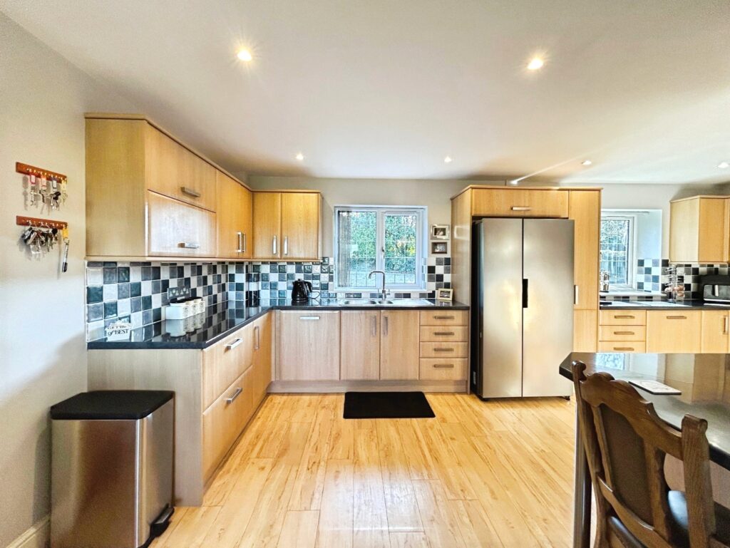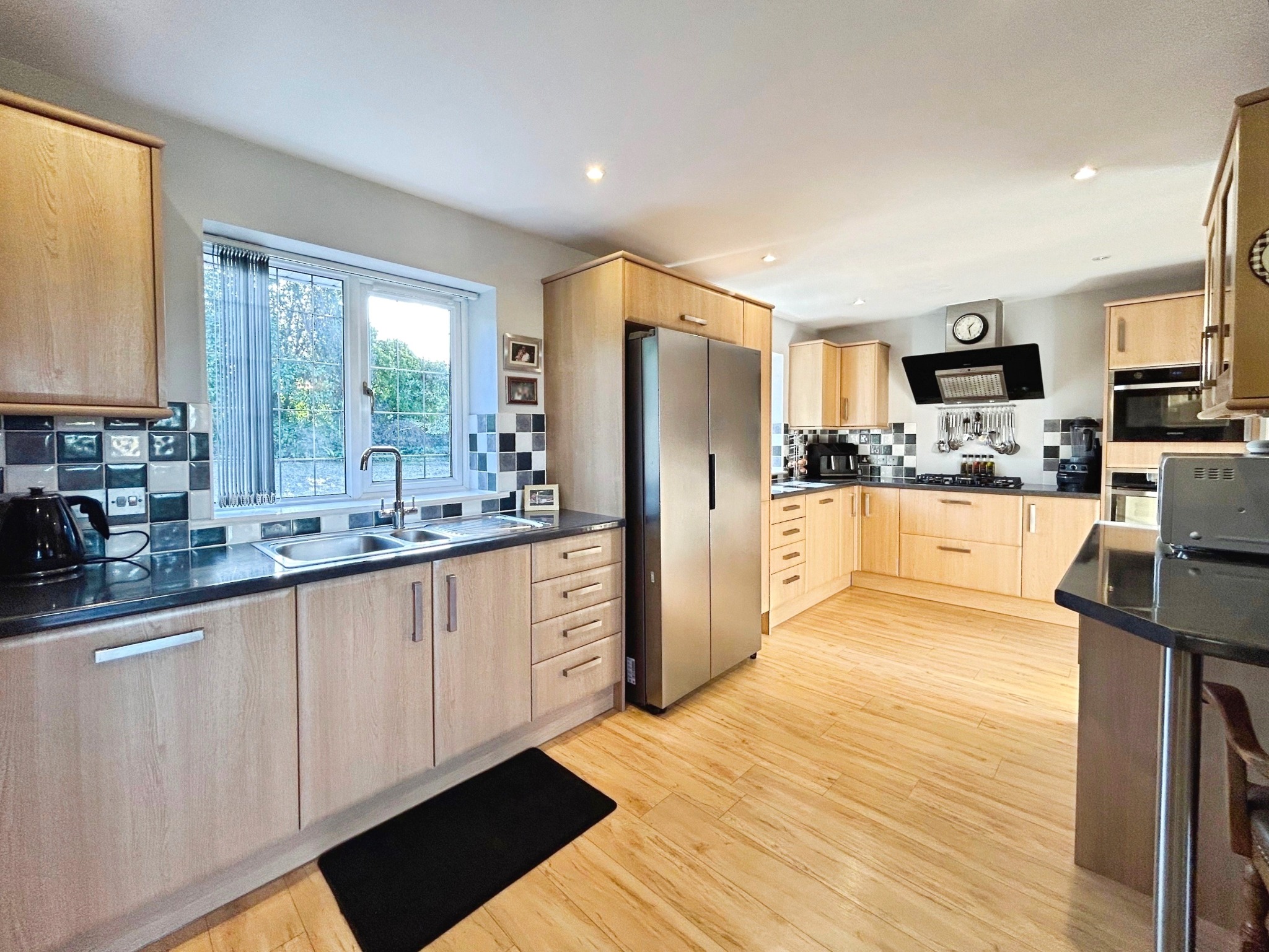 Fitted with a range of high and low level cabinet units with adjoining worktops and splashback tiling. Integrated appliances include a Remove – wall-mounted double oven, microwave, five-ring gas hob with extractor hood, stainless-steel one-and-a-half bowl sink with drainer, and dishwasher, with space for a double fridge/freezer. Wood-effect flooring throughout, with windows to the front and rear aspects. The family area comfortably accommodates a dining table, chairs, and/or a sofa suite.