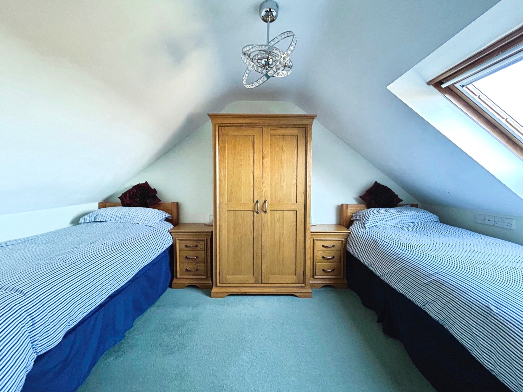A generous double bedroom with Velux window to the rear and window to the side aspect. Includes a range of built-in wardrobes and drawers.