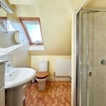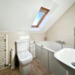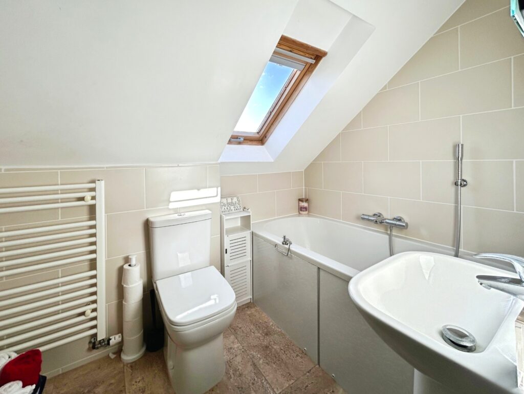 Tiled flooring with Velux window above. Comprises a bath, a shower cubicle and splashback tiling, separate walk-in shower cubicle, WC, wash hand basin, and heated towel rail.