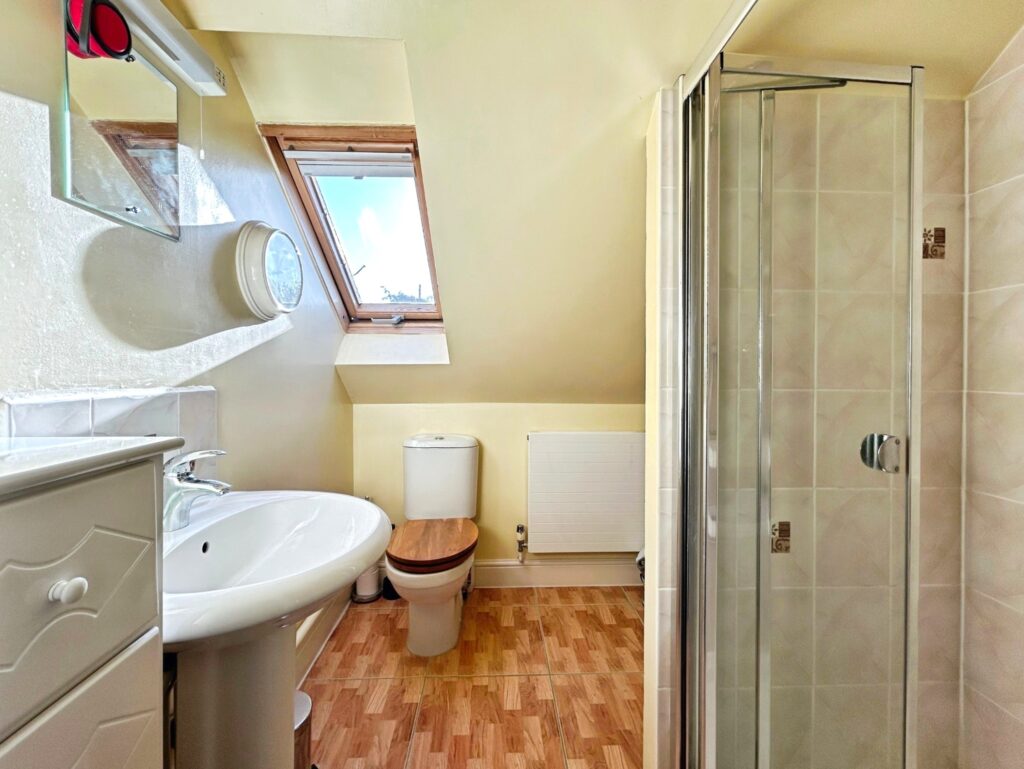 Tile-effect flooring, Velux window, walk-in shower with splashback tiling, WC, wash hand basin with vanity mirror, and extractor fan.