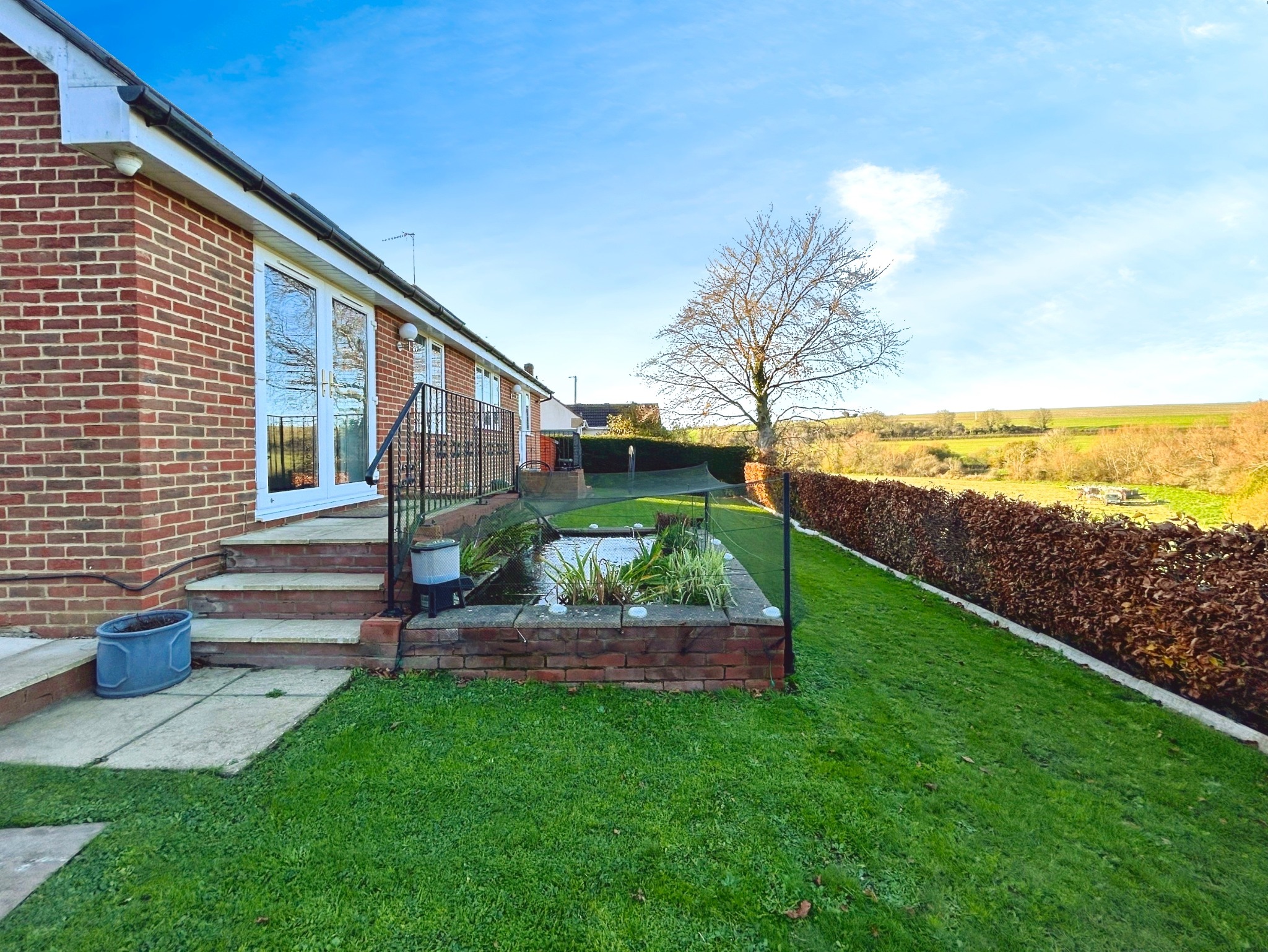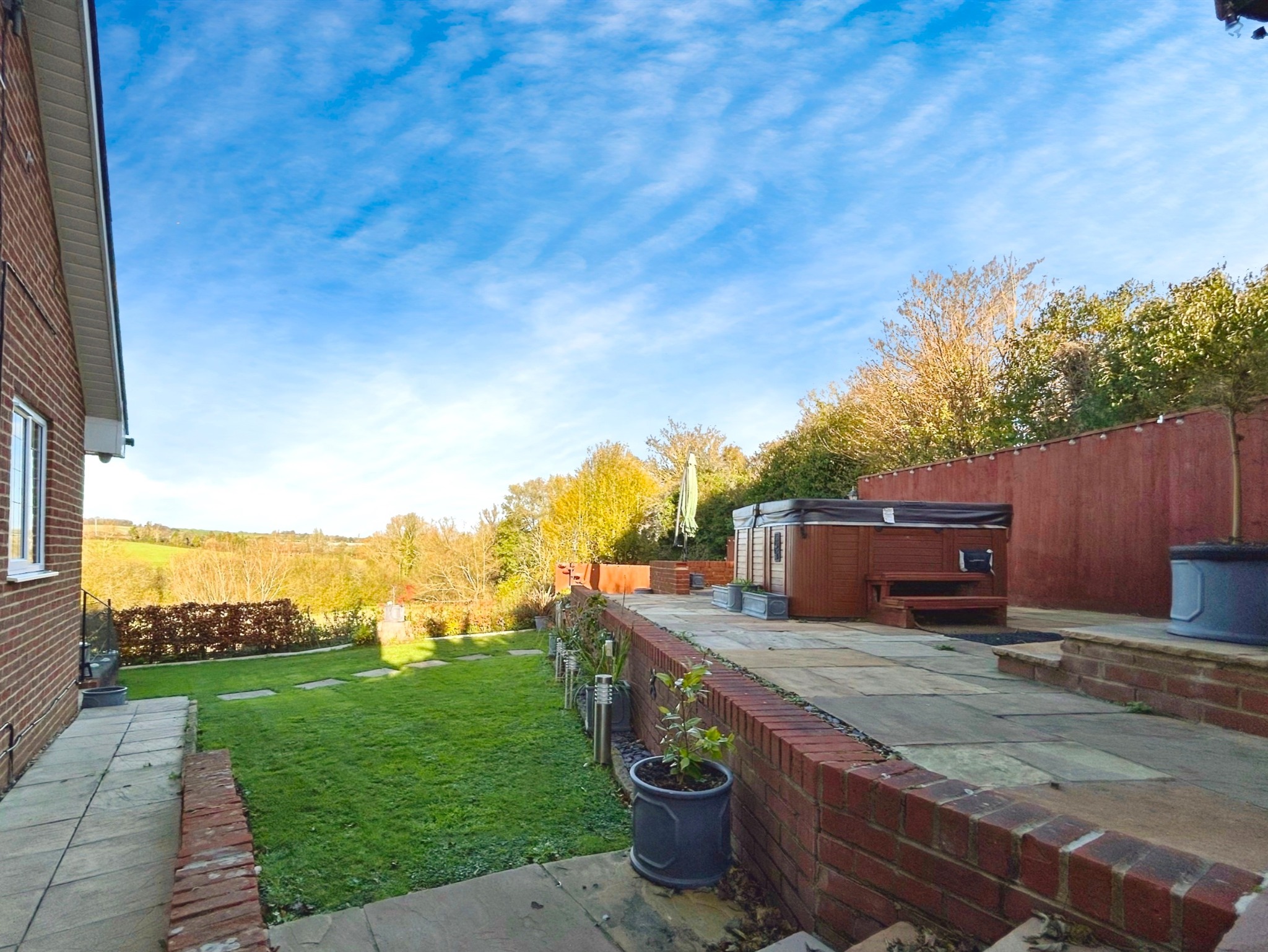 A spacious shingle driveway at the front provides ample off-road parking for multiple vehicles, accompanied by attractive flower beds. The wrap-around garden is mainly laid to lawn with mature planting, shrubs, and rural views over the fields behind. Additional features include a raised patio (currently home to a hot tub), a summer house, a pond, and a variety of areas suitable for potted plants and garden ornaments.