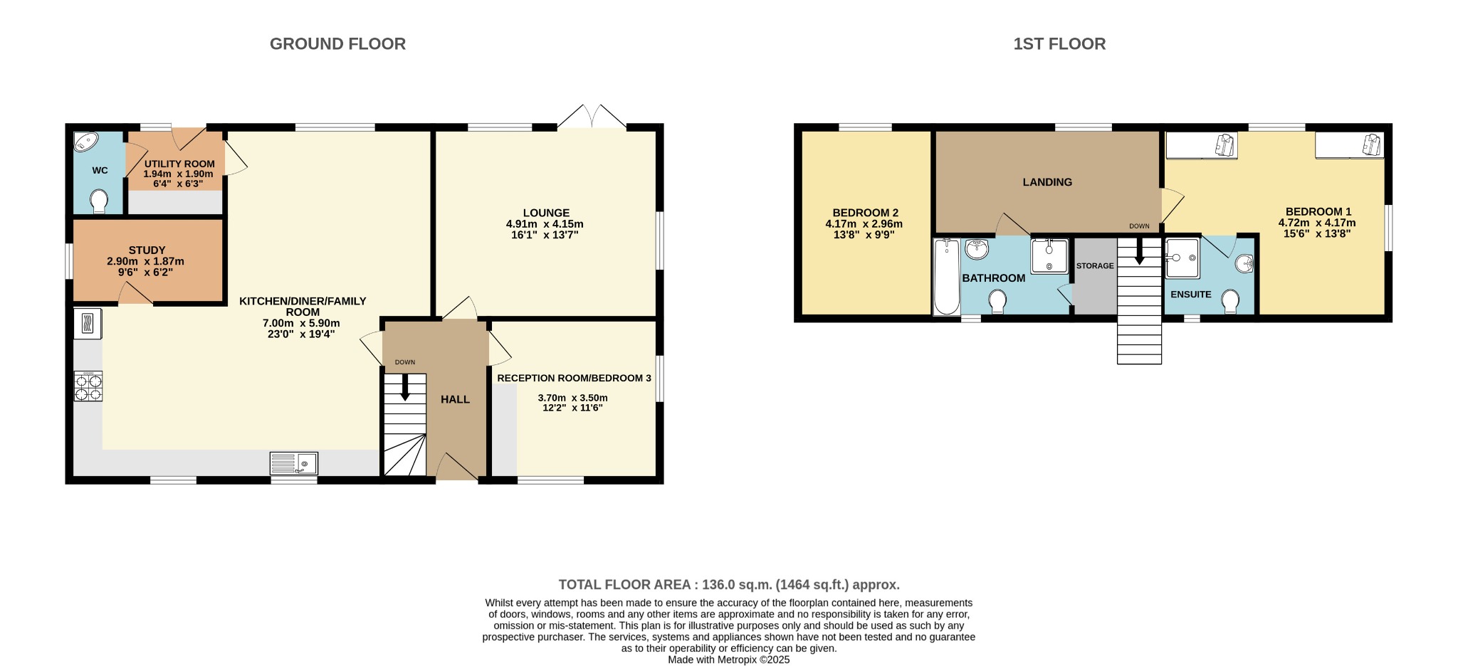 The ground floor features a bright sitting room with double patio doors opening onto the garden, a generous kitchen/family room fitted with a range of integrated appliances, and plenty of space for a dining table and sofa suite. There is also an additional reception room which can be utilised as a third bedroom, a separate study, a utility room, and a cloakroom. The first floor comprises two well-proportioned bedrooms, including a main bedroom with en-suite, alongside a family bathroom.