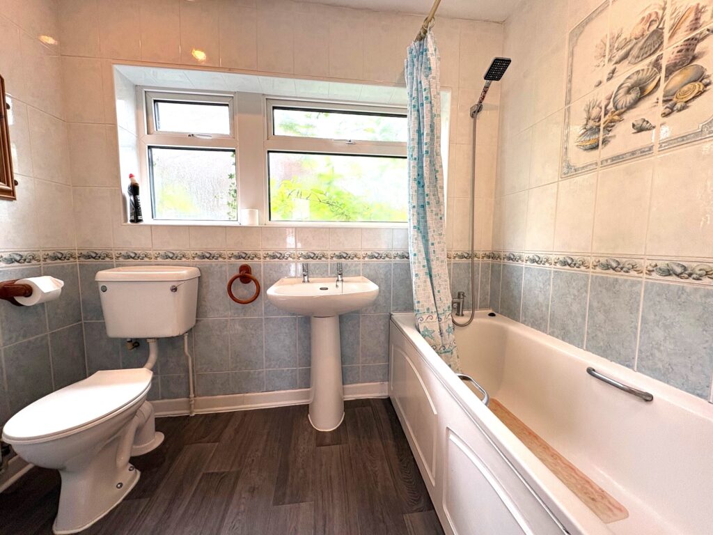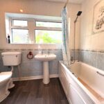 White suite comprising a bath with hand shower, WC and wash hand basin. Radiator, window to the side.