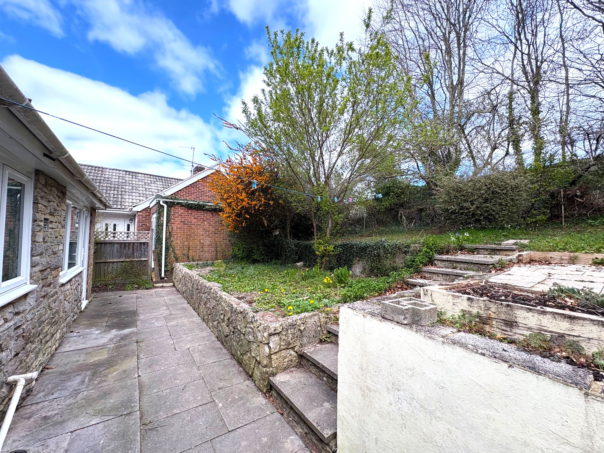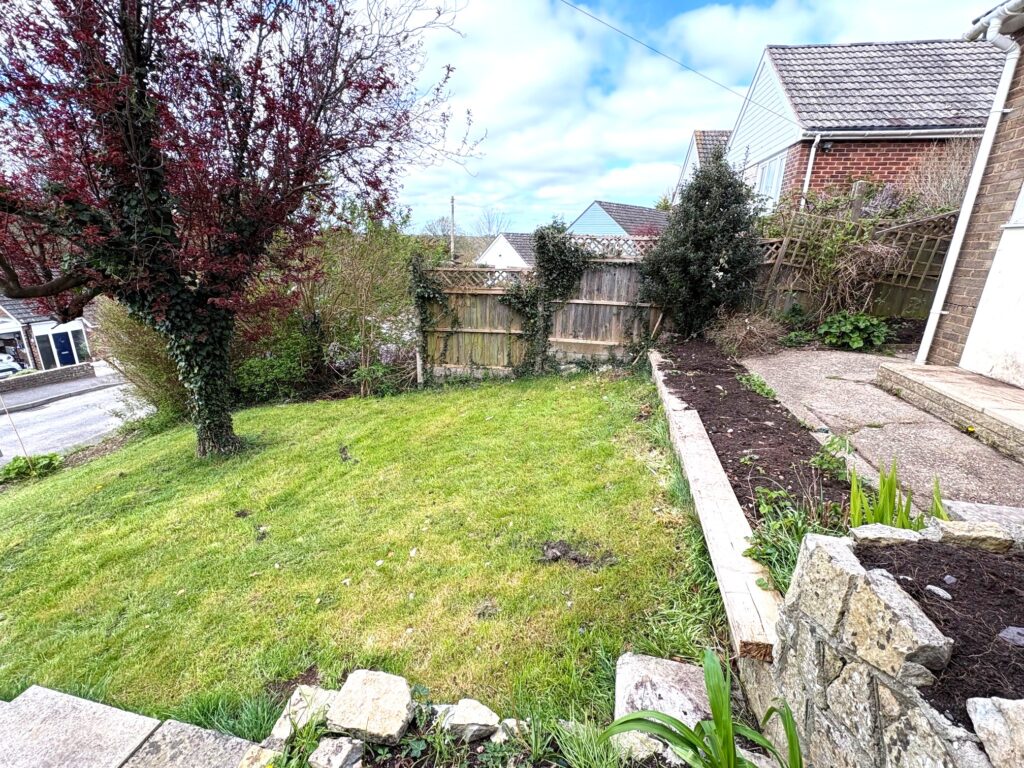 The front garden is laid a lawn with some trees, steps lead up to the front door. The rear garden is tiered up from the bungalow and comprises a paved patio, lawn plus some trees and flower beds. Garden shed, side acces gate.