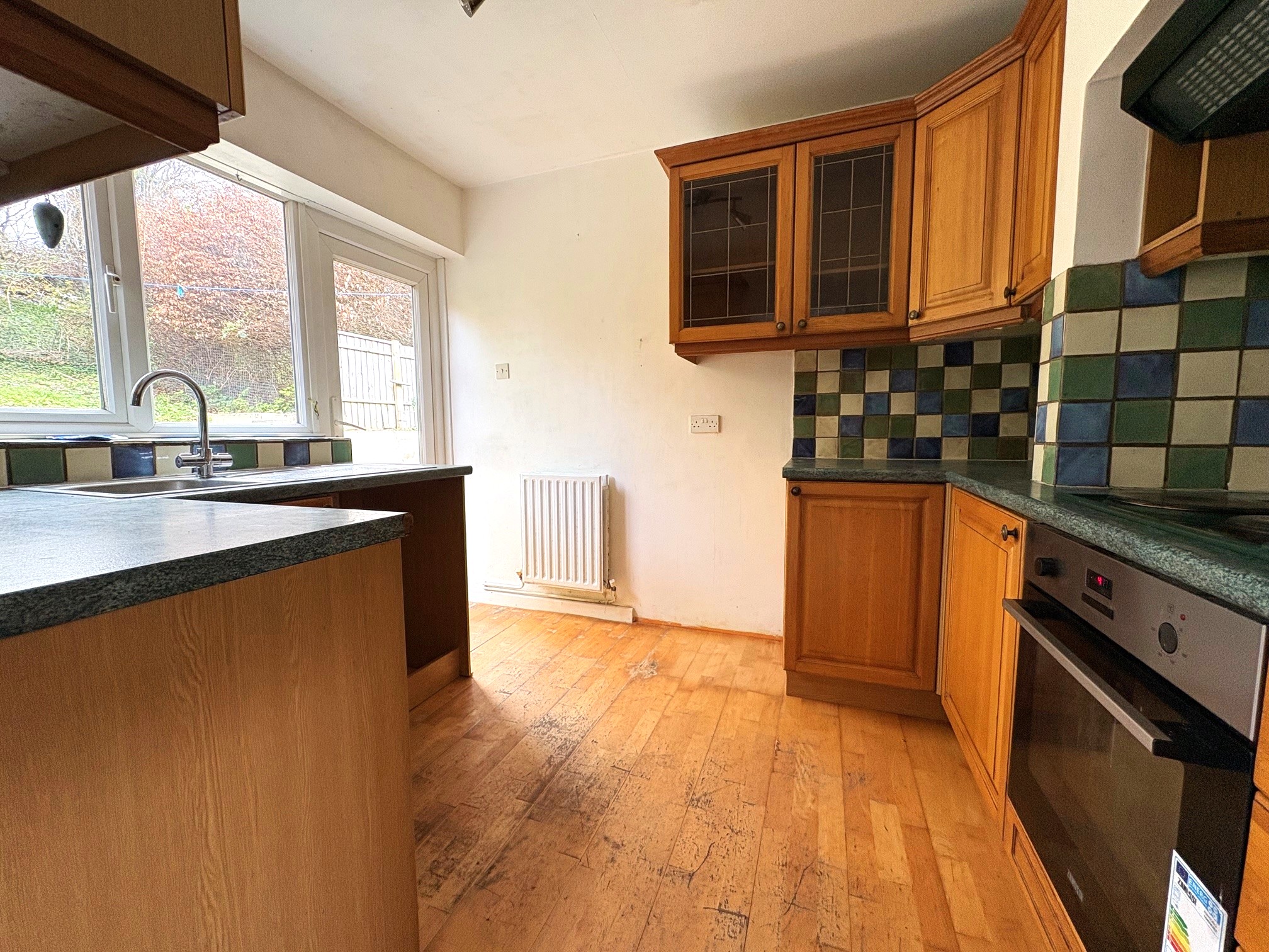 Fitted base units with inset sink. Range of wall cabinets. Inset electric hob with electric oven below and hood above. Space and plumbing for a dishwasher. Part tiled walls, radiator, window to the rear, door to rear garden.