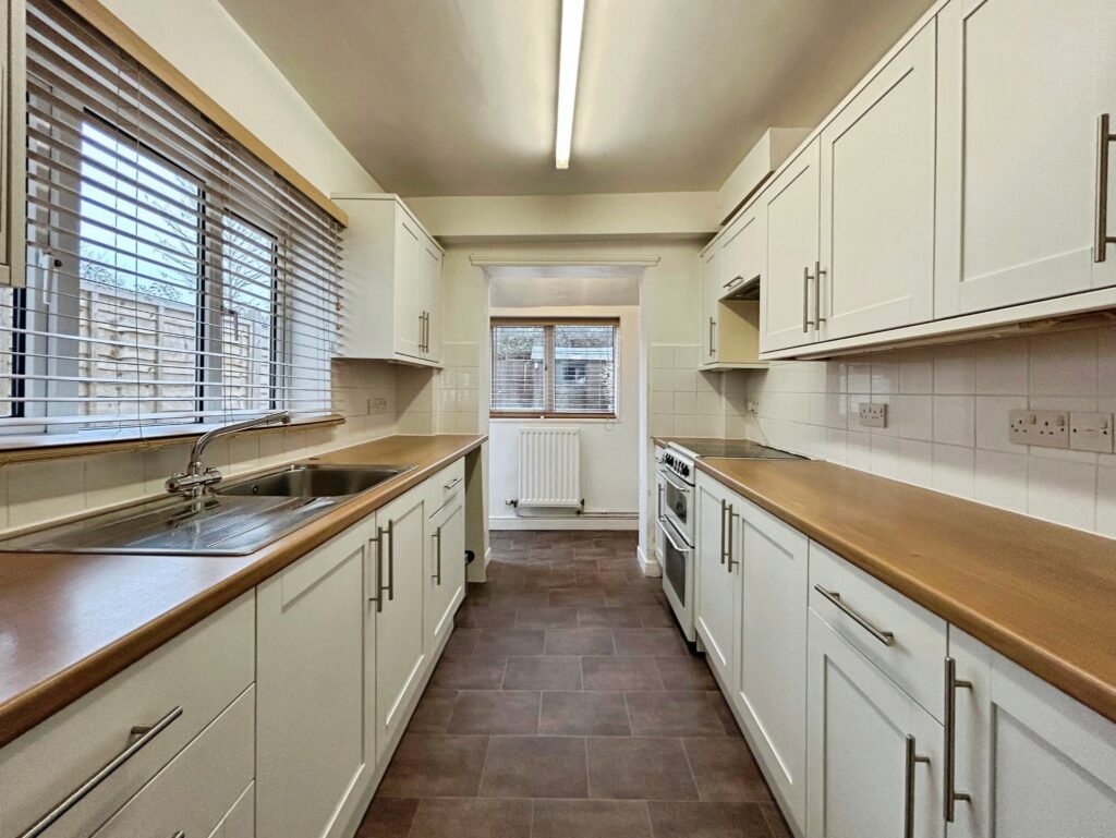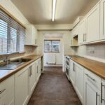 uPVC window to side aspect, white fitted cupboards, freestanding cooker, space for washing machine, smooth ceiling, vinyl flooring, radiator, uPVC rear door accessing the garden.