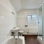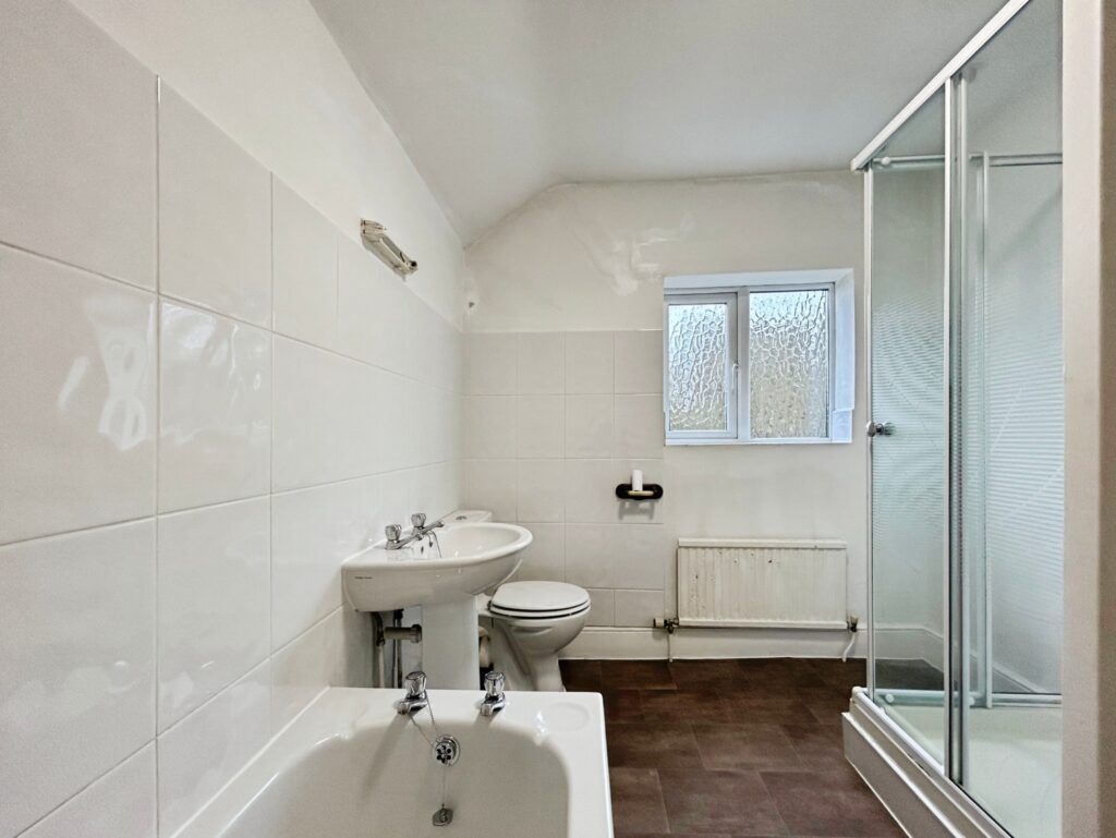 uPVC window to rear aspect, vinyl flooring, sink basin, toilet, shower cubicle, bath, radiator, smooth ceiling.