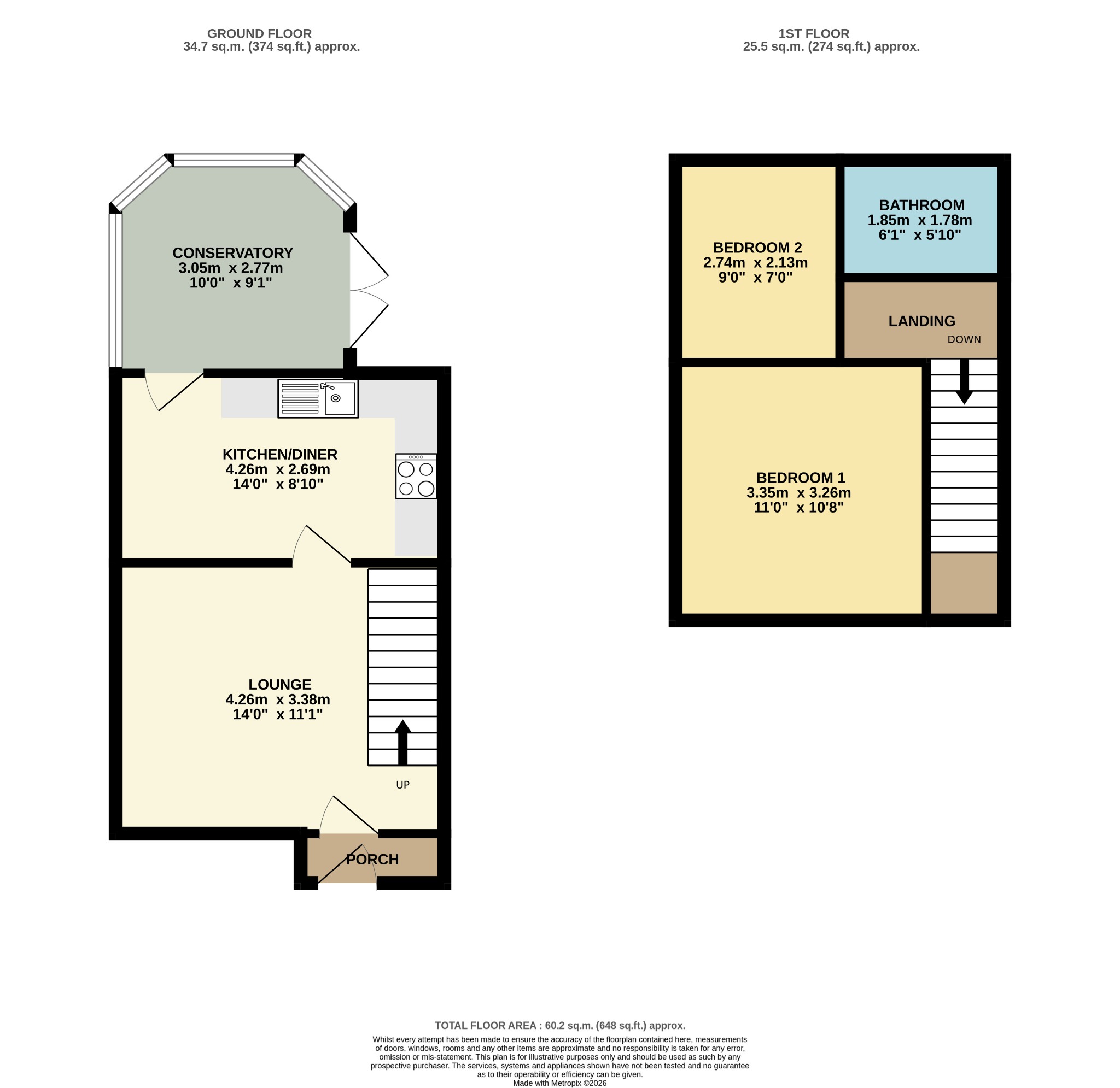 Upstairs, the principal bedroom is a good-sized double with a fitted storage cupboard, while the second bedroom overlooks the rear garden. The family bathroom is fitted with a bath and overhead shower, WC, and wash hand basin.