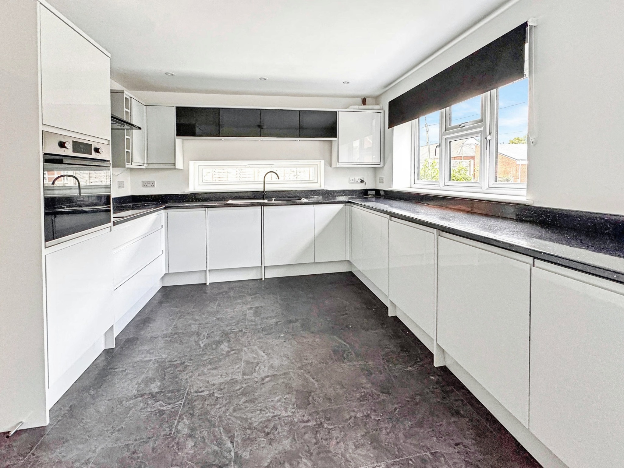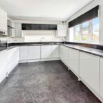 Kitchen area – Fitted range of gloss white fronted base units incorporating cupboards and drawers beneath a worksurface. Further range of matching wall cabinets with under unit lighting. Inset four plate electric hob with canopy over. Built in electric oven, integrated dishwasher, integrated washing machine, two integrated under counter fridges, Under floor heating control, window to the side, window to the front.