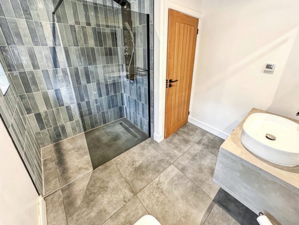 Modern fitted white suite comprising a walk in double shower area with thermostatic shower including a drench head. WC, wash hand basin with drawer beneath, under floor heating control, two windows to the side.