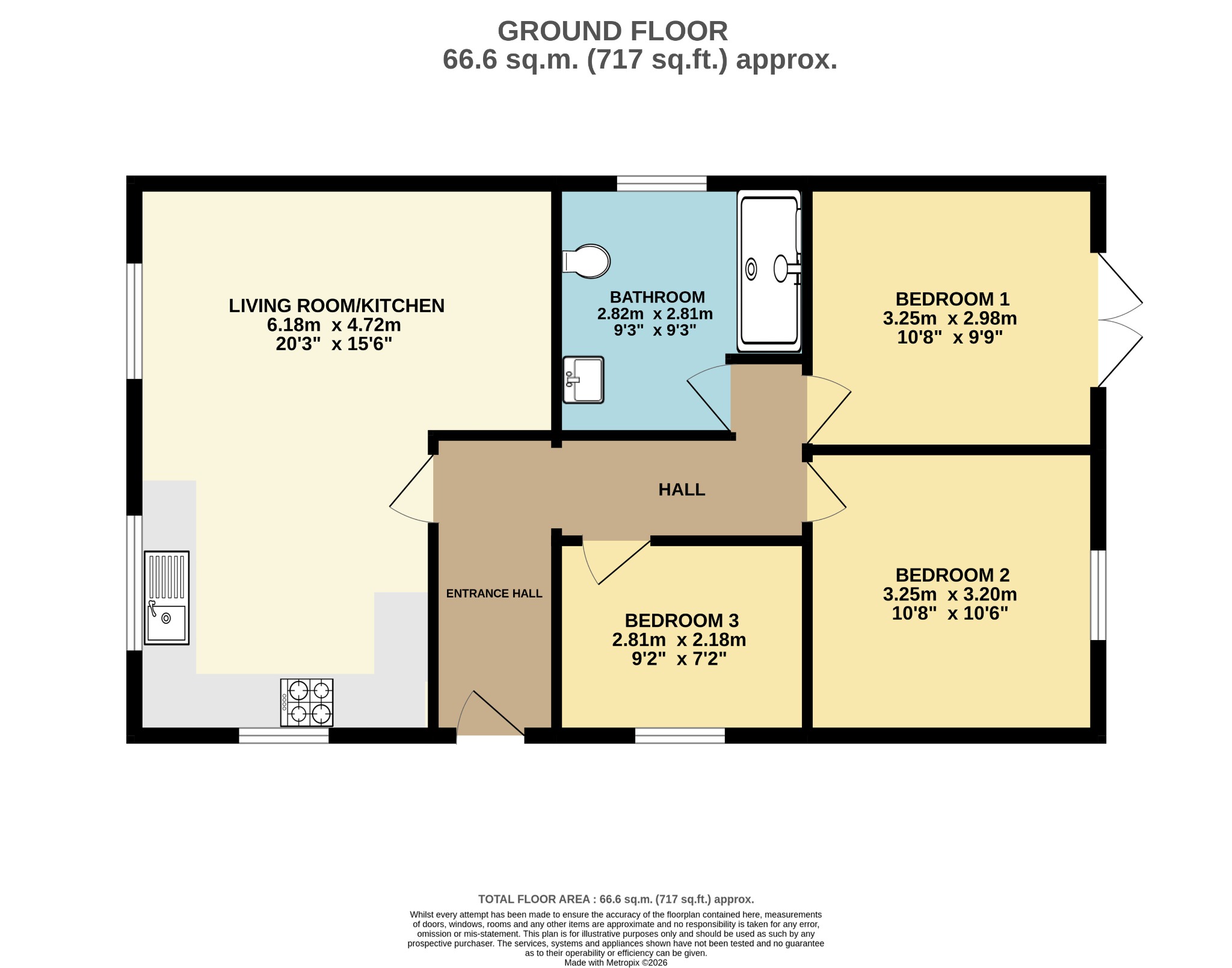 Approaching the bungalow from the driveway the front door is located on the side of the property. This opens to a welcoming entrance hall that gives access to all rooms. The open plan ‘hub of the home’ Living room/kitchen is a great space for the owners to relax, cook and dine in. All three bedrooms are a good size and the main bedroom has French doors that open to the rear garden. The bedrooms are complimented by a modern fitted shower room with walk in shower area. Outside there is plentiful parking and a level garden. The property benefits from double glazing and under floor gas fired central heating.