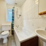 Suite comprising a bath with shower over, WC and wash hand basin. Radiator, window to the rear.