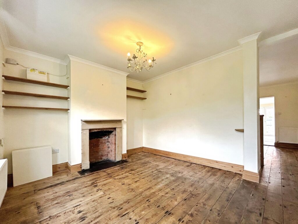 Window to rear, cast iron fireplace, stairs to first floor with recess beneath, radiators, access to kitchen.
