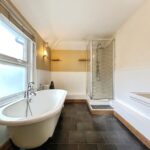Window to rear, brick fire recess with pine surround and slate hearth, radiator. Bath with mixer tap and shower attachement, WC and wash hand basin, radiator, shelved cupboard. Window to side in en-suite.