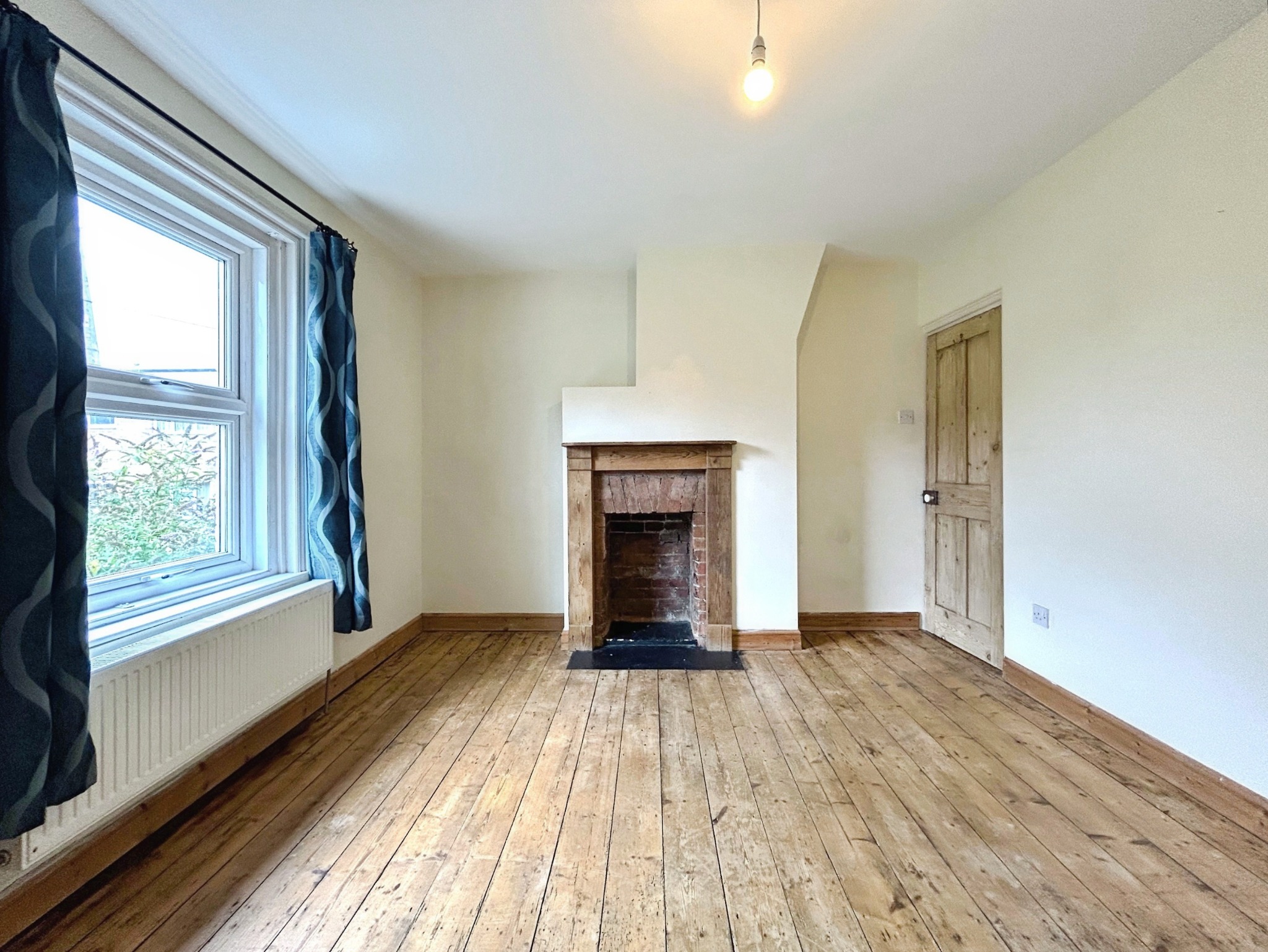 Window to front, exposed wooden flooring, brick fireplace with pine surround and slate hearth with open shelving to eithe side, radiator, television aerial point.
