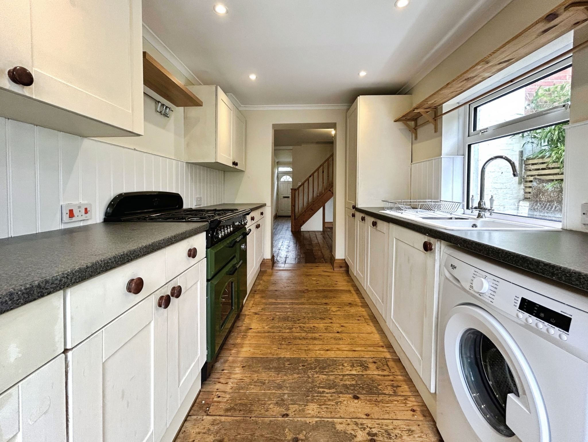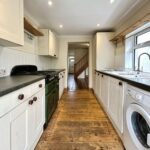 Fitted kitchen with numerous base and wall units, one and a half bowl sink unit, integrated fridge/freezer and dishwasher. Plumbing for washing machine. Space for range cooker, halogen lighting, Kickspace heater, uPVC double glazed french doors to the garden.