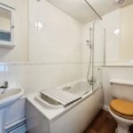 Fitted with a white suite comprising a bath with overhead shower, WC, and wash hand basin. Well-maintained and in good condition.