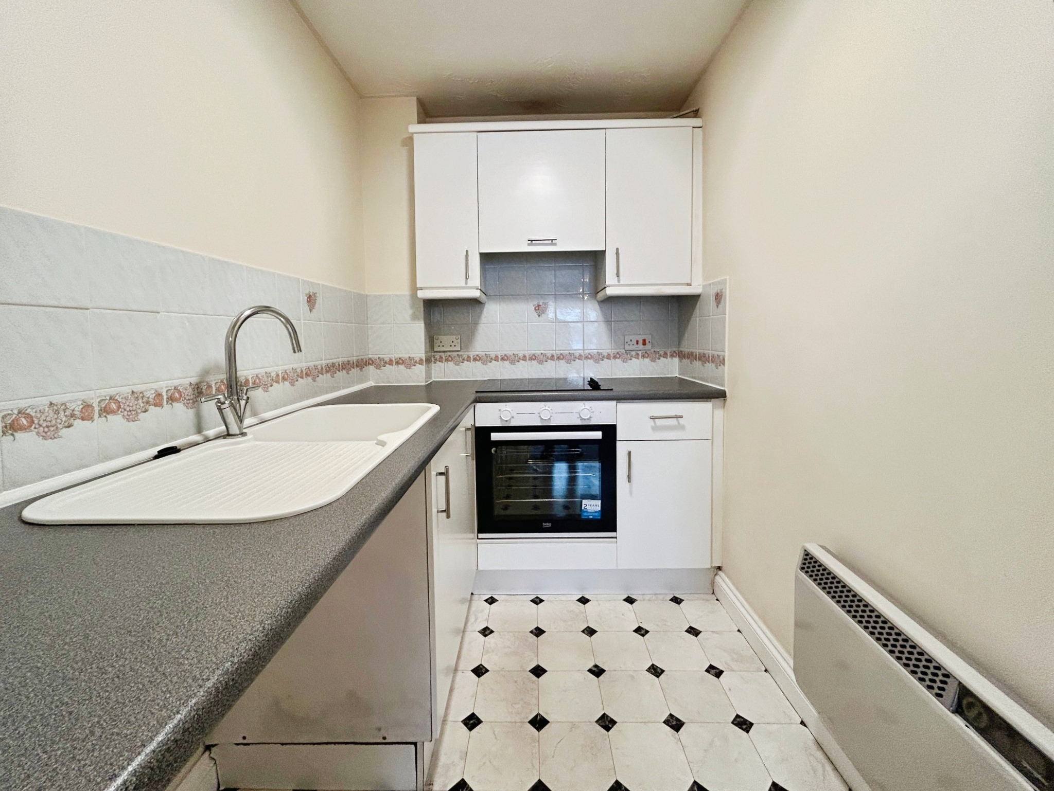Fitted with a range of base and wall units, a built-in oven, and spaces for a washing machine and dishwasher. The kitchen is neat and functional but would benefit from some modernisation.