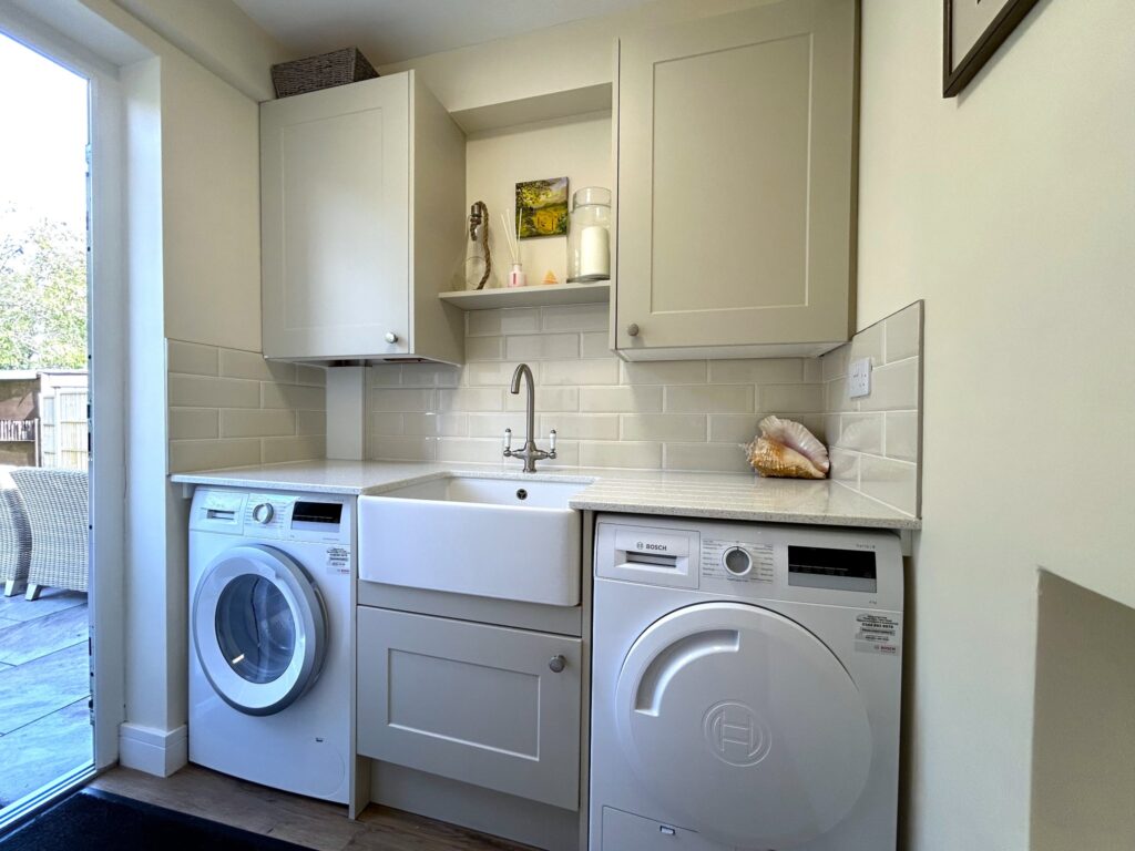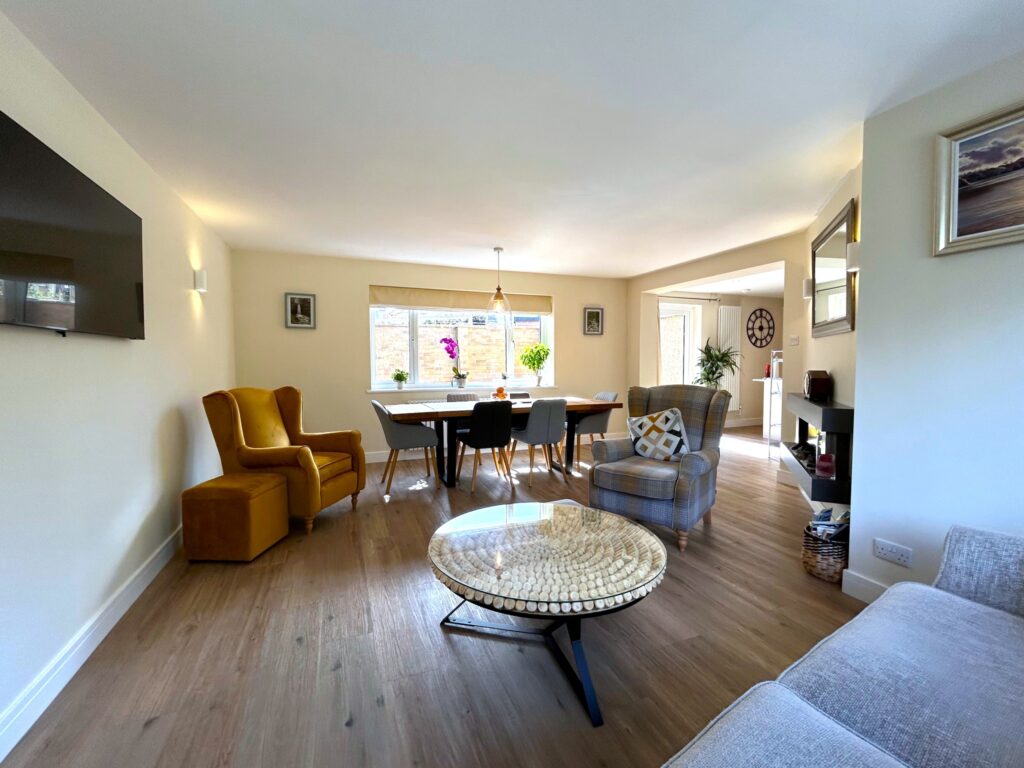 A superb family living space with modern kitchen, central island, built-in Neff induction hob, twin ovens, a dishwasher. There is plenty of room for a good size dining table. Doors to main garden and courtyard. Radiators.
